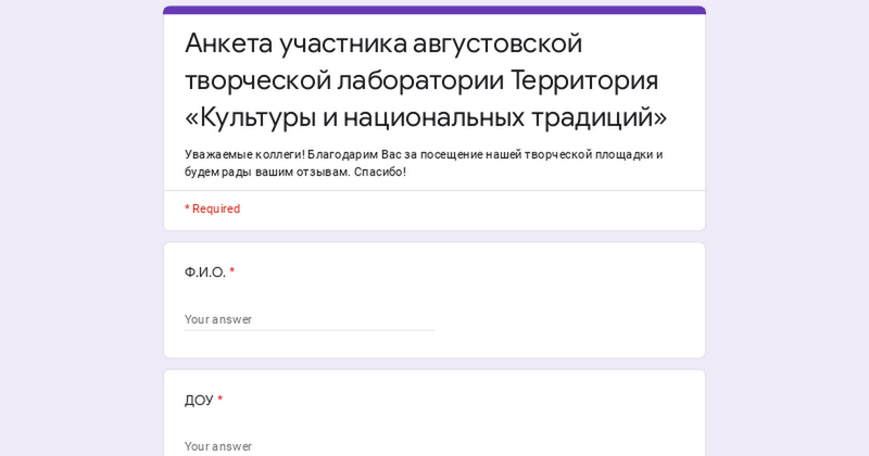 Анкета участника августовской творческой лаборатории Территория «Культуры и национальных традиций»